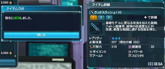 ヴィタ系武器の強化にかかるメセタは1回3060メセタ(間違ってたらごめん)。